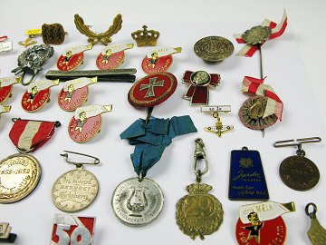 Samling emblemer, medailler og enkelt slipsenål (36)