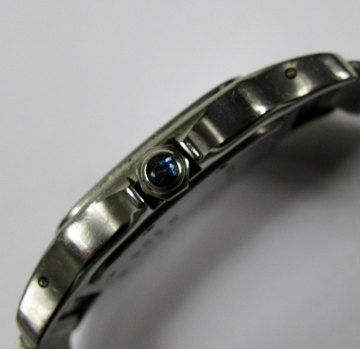 Cartier Santos herrearmbåndsur i kasse af stål med cremèfarvet skive, romertal, kvadtratisk stregindikation og datovisning i #6 positionen. Quartzværk, krone prydet med diamantsleben safir. Lænke af stål med flip-lock spænde. Urkasse ca. 29 x 29 mm.