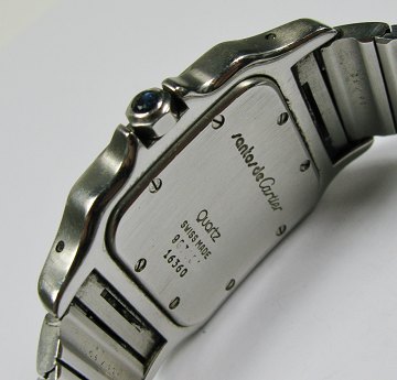 Cartier Santos herrearmbåndsur i kasse af stål med cremèfarvet skive, romertal, kvadtratisk stregindikation og datovisning i #6 positionen. Quartzværk, krone prydet med diamantsleben safir. Lænke af stål med flip-lock spænde. Urkasse ca. 29 x 29 mm.