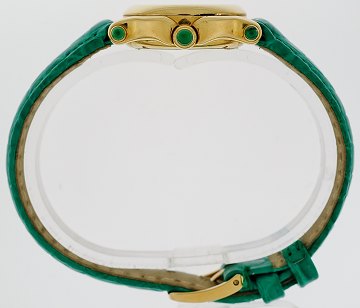 Damearmbåndsur fra Chopard, model Happy Sport, ref.nr.: 27-6150-22, i kasse af 18 kt. guld, lys skive m. romertal, fem guldindfattede, brillantslebne diamanter ligger løst mellem skiven og safirglasset, monteret m. original læderrem og spænde af 18 kt. guld, krone og horn er prydet m. carbochonslebne smaragder, quartz urværk. Ø. 26 mm.