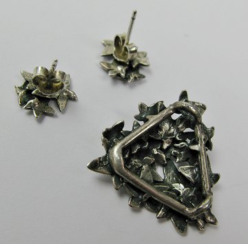 Par ørestikker og vedhæng af sterling sølv i form af vedbendblade. Vedhæng L. ca. 30 mm. Samlet vægt ca. 7,2 gr.