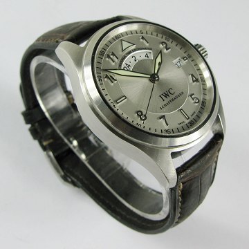 IWC "Die Fliegeruhr UTC", herrearmbåndsur i kasse af stål, safirglas. Metalgrå skive med arabertal og stregindikationer, central sekundviser, alternativ timevisning på skive under "12 positionen og datovisning i #3 positionen. Diam. ca. 39 mm. Automatisk værk kaliber 2892. Original læderlænke med metalspænde.