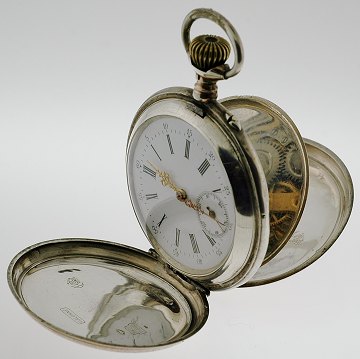 Dobbeltkapslet herrelommeur fra i kasse sølv, hvid skive m. romertal, seperat sekundviser, manuelt optræk. Ø. 49 mm.