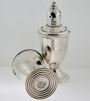 Klassisk salt og peber-sæt fra Duchin Creations, udført i såkaldt "Hollowware", hvor et glaskorpus er betrukket m. en sterlingsølvkappe, stemplet Duchin Creations. H. 11 cm.