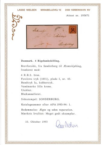 4 RBS på brevforside blækannuleret. Ferslew tryk, plade I nr. 43 sendt fra Sønderborg til Ærøeskøbing. Attest Nielsen.