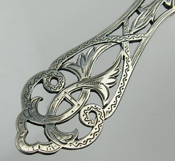 Dansk skønvirke kagespade af sølv. Laf med gravure i form af buket, hjerte og blomsterdekorationer samt gennembrudt håndtag. Stemplet OD og København 94. L. ca. 27 cm., vægt ca. 81 gr.