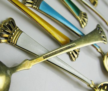 12 danske Ela moccaskeer af forgyldt sterlingsølv, dekoreret med krone og emaille. L. ca. 9,5 cm., samlet vægt ca. 118 gr.