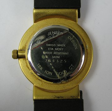 Jacob Jensen damearmbåndsur i 18 kt. forgyldt kasse. Tofarvet, matteret skive med stregindikationer og tofarvet "rød/grøn" sekundviser. ETA quartzværk. Skive Diam. ca. 30 mm. Vægt ca. 28 gr. Originallænke af gummi.