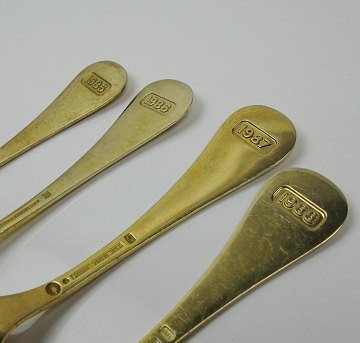 4 Georg Jensen årsskeer 1985,-86,-87,-88 af forgyldt sterling sølv, dekoreret med emaille i form af blomster. L. ca. 15 cm.