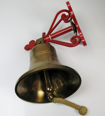 Skibsklokke af malm med ophæng af bemalet metal