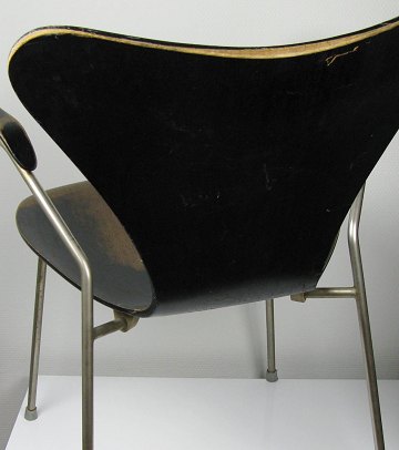 Arne Jacobsen 7'er stol med armlæn, model 3207. Oprindelig sortlakeret skal og armlæn med charmerende patina, metalstel med lettere overfladerust. Løs ryg.