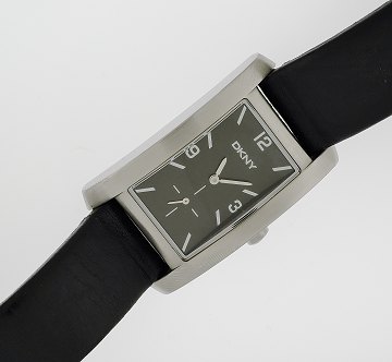 Damearmbåndsur fra DKNY(Donna Karen New York) i kasse af stål, sort skive m. arabertal og stregindeks, seperat sekundviser, mineralglas, monteret m. original sort læderrem og stålspænde, quartz urværk. Ø. 26x34 mm.