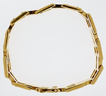 Bred armlænke af 14 kt. guld, udført hos Aage Albing, København m. dobbelte sikkerhedshaspe. L. 19 cm., B. 2,2 cm.