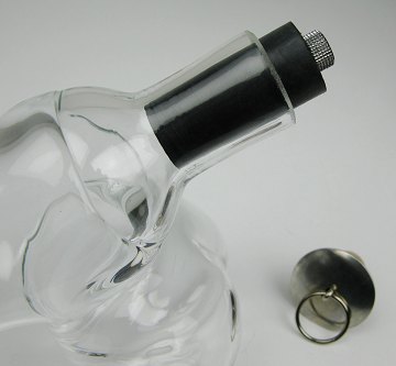 Holmegaard karaffel i form af fallos af glas, designet og fremstillet af glasmager Kurt Jensen. Original prop af kork med metalkappe medfølger, ligesom der medfølger en mere kunstnerisk prop af gummi/metal, designed af KS 2012.