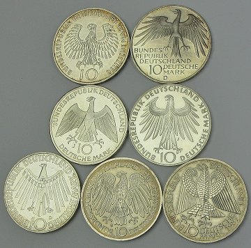 Tyskland, 10 mark SØLV 1972(5) og 1987(2) - KM 130, 131, 132, 133, 135, 166, 167