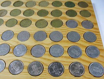 Danmark, samling 1 kr, diverse årstal i displaykasse af fineret fyrretræ med låg af plexiglas.