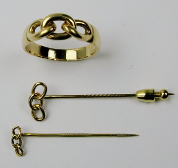 Sæt Odd Fellow logesmykker med ankerkædesymbolik af 14 kt. guld, bestående af ring Str. 68, slipsenål og nål.