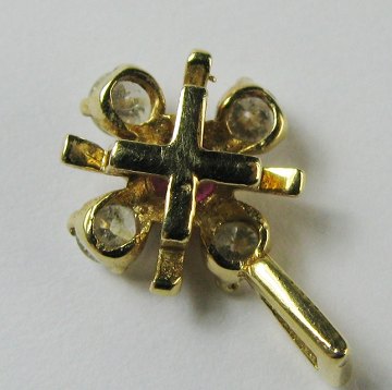 Vedhæng af formodentlig 14 kt. guld, prydet med 4 diamantslebne brillanter, ca. 0,24 ct. samt diamantsleben rubin. Diam. ca. 3,4 mm. L. ca. 14 mm.