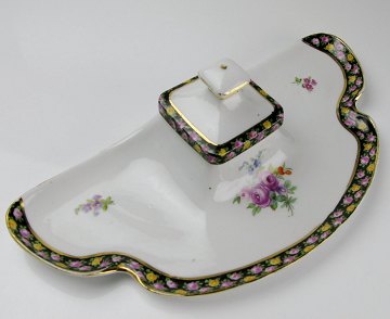 Antikt skrivesæt af porcelæn, dekoreret med blomsterbort og blomster, stemplet med krune. L. 24 cm. 19. årh. slutning.