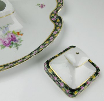 Antikt skrivesæt af porcelæn, dekoreret med blomsterbort og blomster, stemplet med krune. L. 24 cm. 19. årh. slutning.