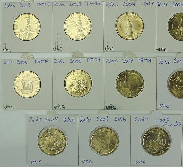Samling tema- og erindringsmønter, bestående af: 10 kr 1986(glat rand), 2005-2009 komplet, 20 kr 1990-2010 komplet.