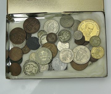 Lot mønter fra bl.a.: Portugal, Norge, Danmark, New Foundland, Sverige, Tyskland, Schweiz samt 1 kr-seddel 1921.