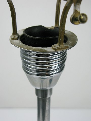 PH lampefod fra efter 1933 med forniklet stamme til 4/3 bordlampe, formodeltlig renoveret med forkromede fatningsdele og endnu senere skærmafslutning af hvid bakelit. Original fod med tværgående tænd/sluk kontakt.