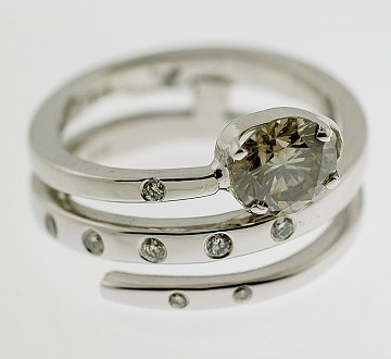 Snoet ring af 14 kt. hvidguld, prydet m. én champagnefarvet, brillantsleben diamant på ca. 1,10 ct. VS samt 8 mindre, slebne diamanter på ialt ca. 0,11 ct. Stemplet "JH 585". Str. 54 1/2.