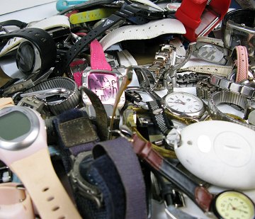 Her har du chancen for at anskaffe dig en grundstamme til dit fremtidige varelager. 65 forskellige armbåndsure, som skal efterses eller bare forsynes med et nyt batteri. Samlet over 1,9 kg.