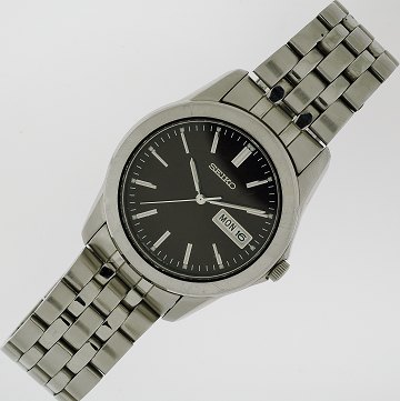 Herrearmbåndsur fra Seiko, i kasse og m. lænke af stål, sort skive m. stregindeks, dag- og datoangivelse ved 3" position, mineralglas, quartz urværk. Ø. 38 mm.
