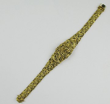 Massiv Alpina armlænke med smykkeur af 18 kt. guld. Oplukkelig lænke, bag hvilken lille ur med hvid skive, stregindikationer og optræksværk. Lænke L. ca. 18,5 cm.