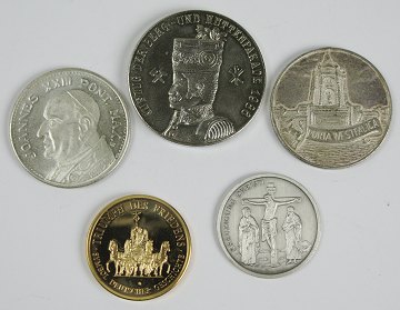 Samling medailler bestående af Tyskland, 5 mark 1908 "Porta Westfalica", Pave Johannes XXIII, Berg- und Hüttenparade Freiburg 1986, Katolsk madedaille "Kristi Korsfæstelse" samt 200 år Brandenburger Tor 1991. Fem medailler i alt.