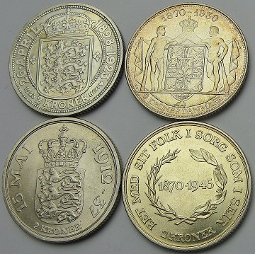 Lot danske jubilæumsmønter, bestående af: 2 kr 1923,-30,-37,-45.