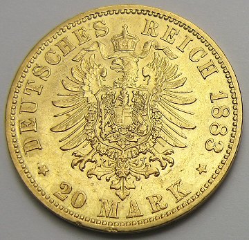 Preussen, Wilhelm I, 20 mark GULD 1883A - KM 505