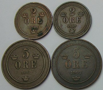 Lot svenske mønter, 1, 2 og 5 ører.