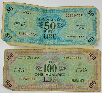 Lot nødpengesedler udstedt af de Allierede Styrker til brugt i Italien 1943 samt østrigst gulden fra 1866.