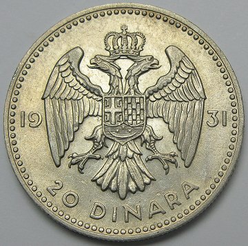Jugoslavien, Alexander I, 20 dinara SØLV 1931 - KM 11