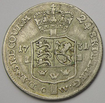 Christian VI, 24 skilling 1731, u. hjerte - H. 6B