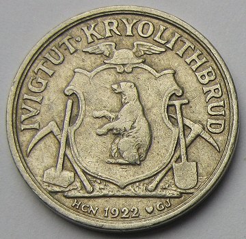 Præget på den Kgl. Mønt i København og har været anvendt i Ivigtut Kryolitbrud indtil 1957, da de blev inddraget, og derefter blev der anvendt officielle mønter.