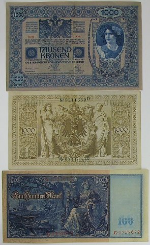 En østrigsk og to tyske pengesedler fra før Første Verdenskrig.