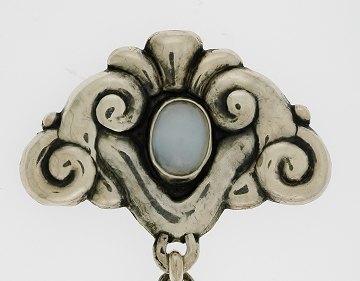 Nydelig broche af sølv, udført i jugendstil m. oganiske former, prydet m. carbochonsleben månesten. Stemplet "P.HK" for sølvsmed P.H. Korsgaard, Varde. Ca. 1920. L. 5,7 cm.