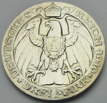 Preussen, Wilhelm II, 3 mark SØLV 1910 - KM 530 *Pæn*
