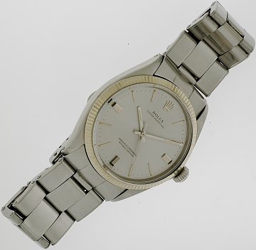 Vintage herrearmbåndsur fra Rolex, model Oyster Perpetual, ref.nr.: 1005, i kasse og med tidlig oysterlænke i stål, hvidguldslynette, sølvfarvet skive m. stregindeks, automatisk urværk. Fra 1967. Ø. 34 mm.