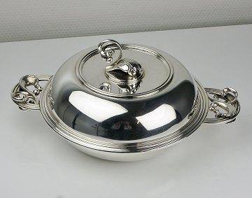 Imponerende lågfad af sterlingsølv, fra sølvsmed C.F. Heise, udført m. stiliseret bladværk. Lågknoppen kan afmonteres og låget anvendes som skål. Stemplet "CF HEISE 157 STERLING 925". Ø. u. hanke 22 cm.