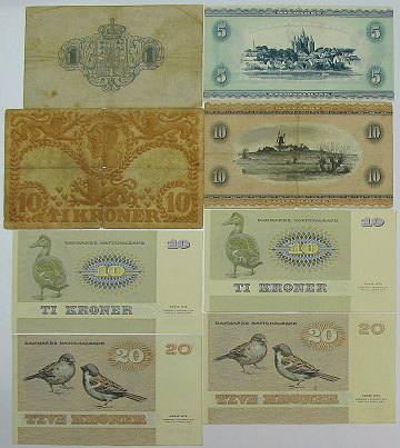Lot danske sedler, bestående af: 1 kr 1921, 5 kr 1955 B0, 10 kr 1939 N2, 1963 H3, 1977,-78, 20 kr 1989,-90.