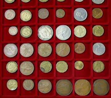 Lot mønter fra diverse lande, bl.a. en del England m. kolonier og enkelte sølvmønter, heriblandt en kopi af vinkingemønt i sølv samt en møntkasse og 2 stk. Lindner møntbakker.