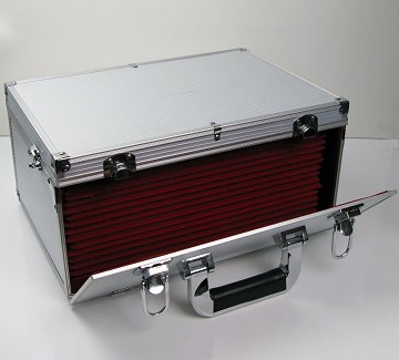 Flot opbevarings- og transportkuffert til mønter, indeholdende 15 filtbeklædte møntbakker med respektiv inddeling til mønter med en diameter på ca 20 - 45 mm. Kassen er med 2 aflåselige snaplukker, sikkerhedsbøjler i siden samt gummiarmeret håndtag. 35 x 25 x 18 cm.