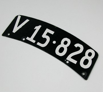 Gl. buet motorcykel nummerplade V 15828 af sort emailleret metal. L. 22 cm.