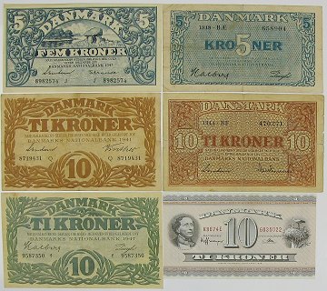 Lot danske sedler, bestående af: 1 kr 1916, 5 kr 1943(2),-48,-60, 10 kr 1939,-41,-42,-43,-44,-47,-67,-71,-77, 20 kr 1985,-88 samt 50 kr 1997.