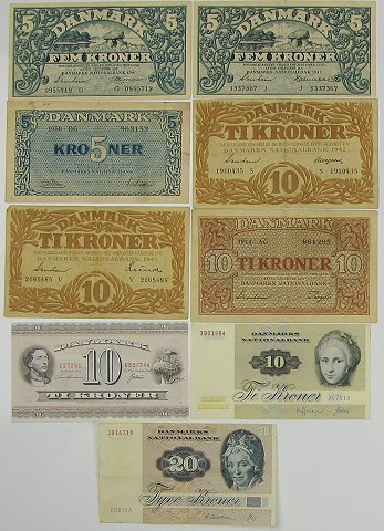 Lot danske sedler, bestående af: 5 kr 1940,-42,-50, 10 kr 1942,-43,-44,-72,-75 samt 20 kr 1987.